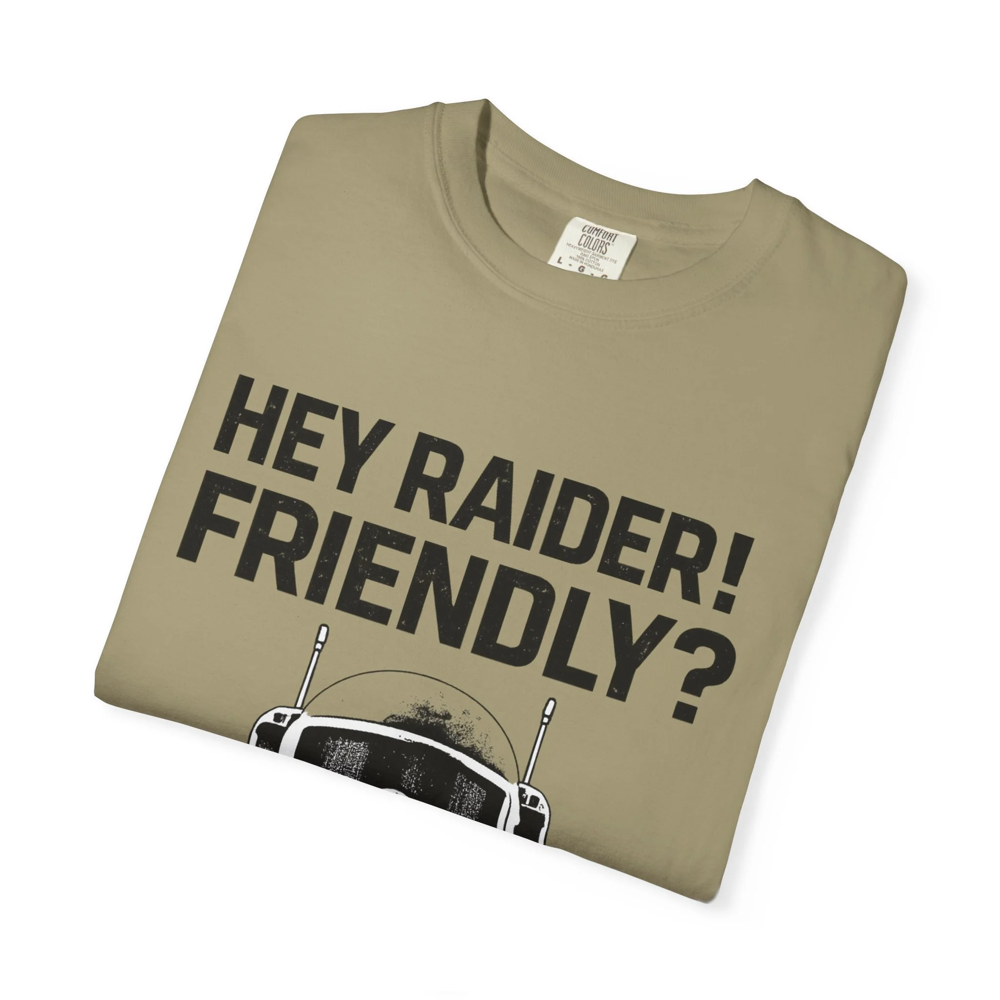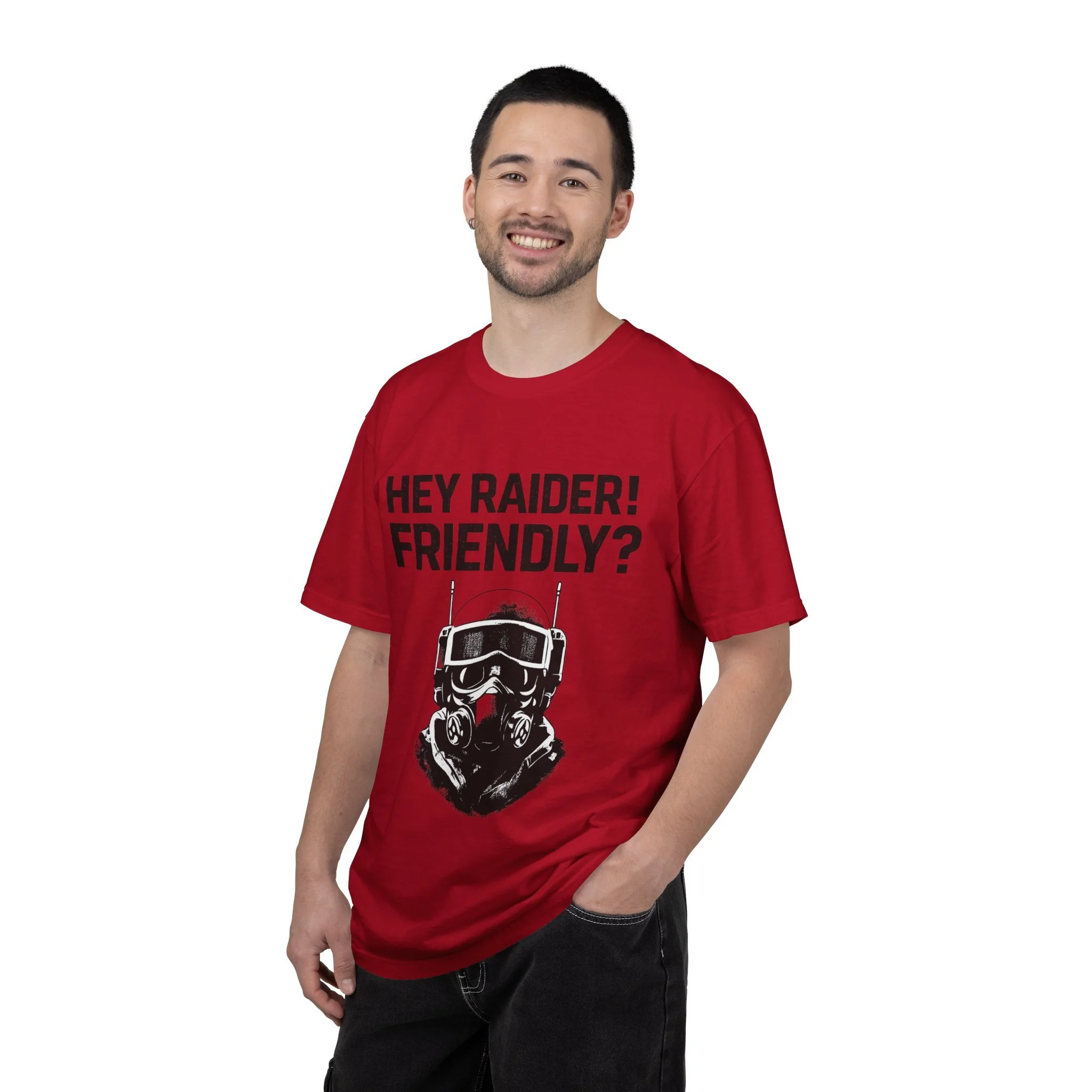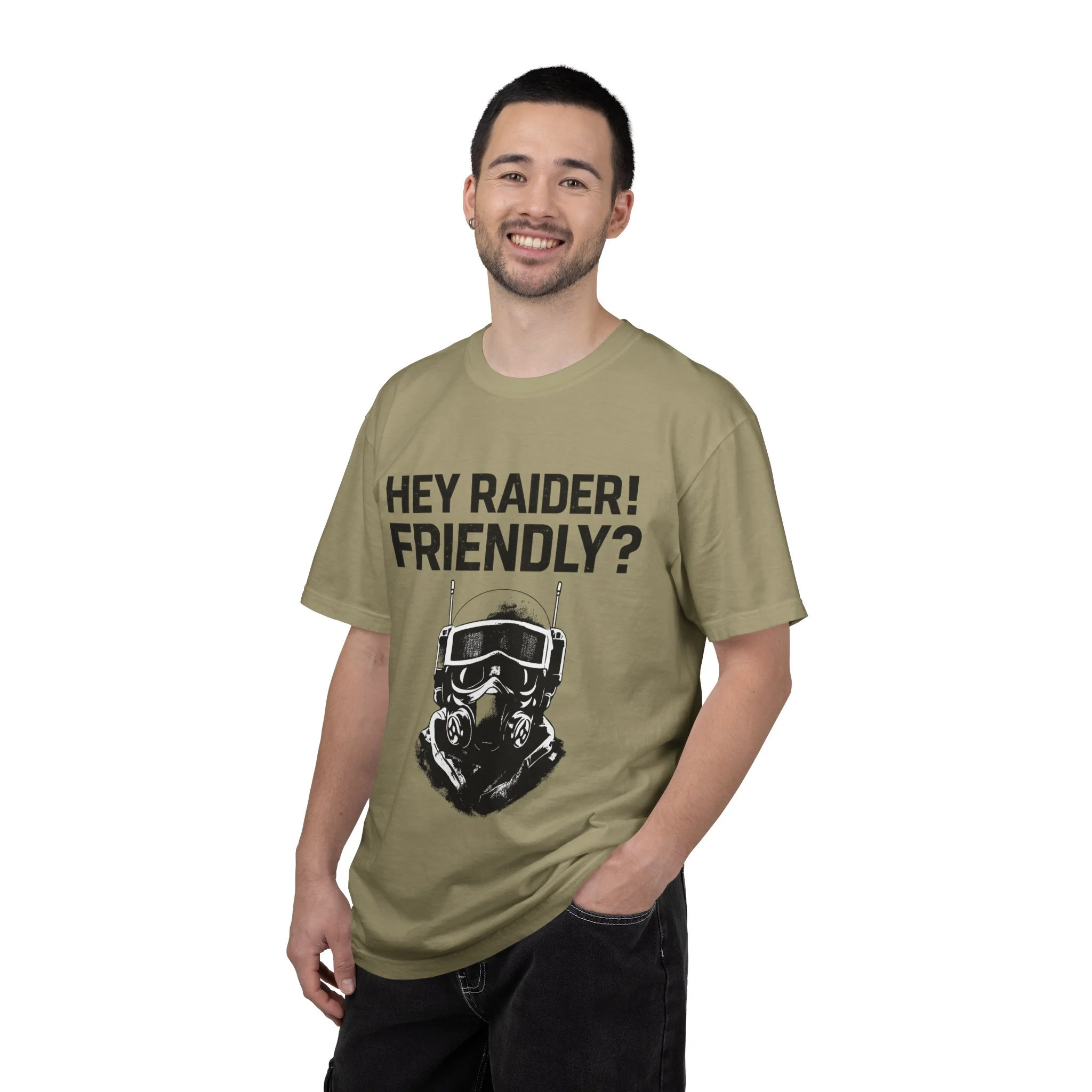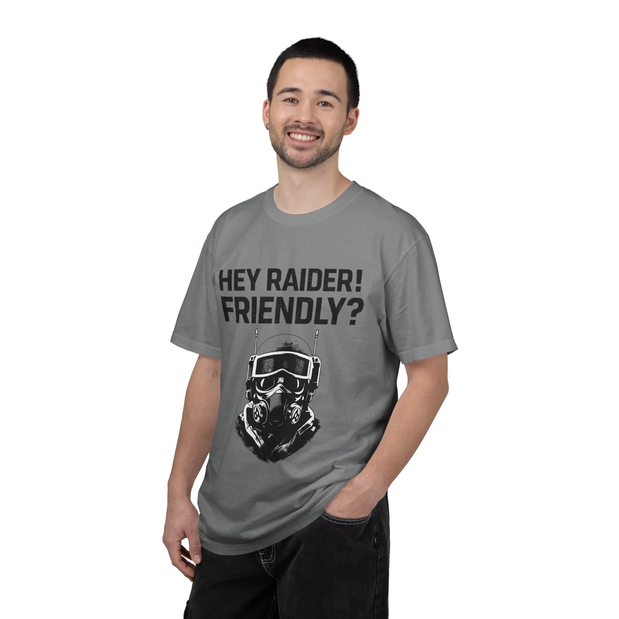 This heavyweight garment-dyed tee brings a lived-in, down-to-earth edge to your everyday rotation. The bold frontline graphic — a tactical helmeted figure with the callout “HEY RAIDER! FRIENDLY?” — reads like a wry, in-world shout from post-apocalyptic skirmishes and airsoft meets. The relaxed, roomy cut and soft, garment-dyed finish feel broken-in from the first wear. Wear it to raids, gaming nights, convention days, or just when you want to signal you belong to the same inside joke and shared stories. The substantial cotton and clean double-needle construction mean it stands up to repeat wears and washes while holding its textured color. Offered in a wide size range and many muted colorways so you can pick the shade that fits your gear closet.